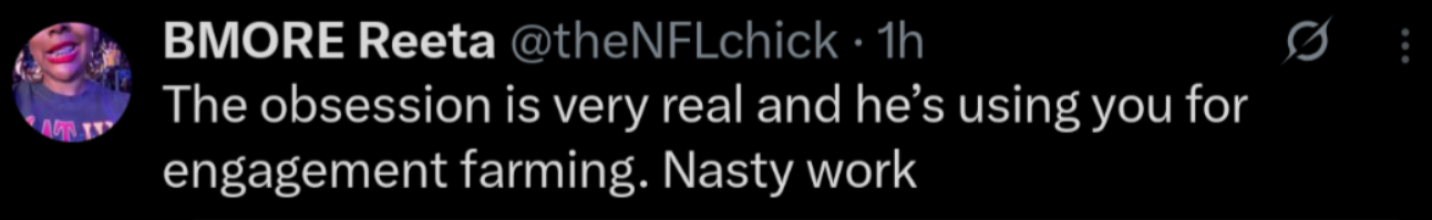 "The obsession is very real, and he's using you for engagement farming. Nasty work."
