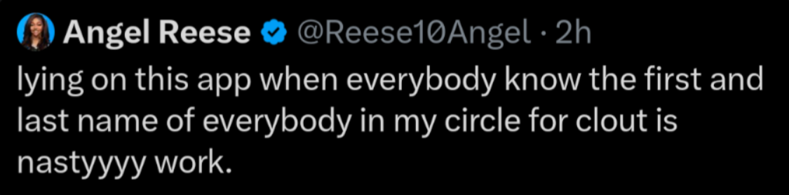 "Lying on this app when everybody know the first and last name of everybody in my circle for clout is nastyyyy work."