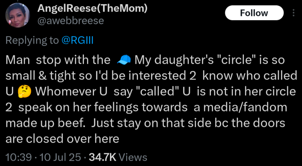 You know what they say about those "inner circles," right? They're usually pretty tight. And Angel Reese's mother, @awebbreese, wasted precisely no time in shutting down RGIII's alleged "insider confirmation". Her response was swift, direct, and devastatingly simple: "🧢".